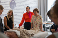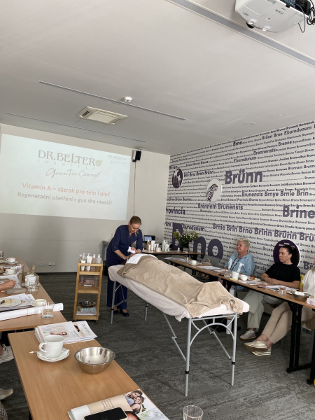 Odpolední program začal po výborném obědě. A "skočili" jsme do něho rovnou praktickou ukázkou regeneračního ošetření s vitamínem A se speciální masáží gua-sha. Jde opravdu o luxusní ošetření, které pokožku nádherně vyhladí a vyživí. A co je úplně nejvíc, tento efekt na pleti ucítíte ještě výrazněji další den! Takže žádná rychlovka na efekt. Při jemné masáži se aktivuje lymfatický systém, toxické látky se vyplaví a pleť nádherně přijímá výživu. Určitě si toto ošetření nenechte ujít v salónech DR.BELTER!